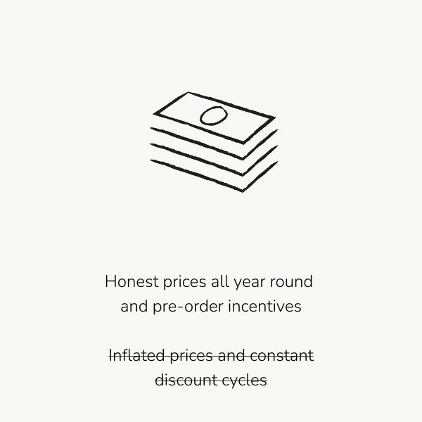 Our edit is a permanent collection of timeless wardrobe staples and we price honestly all year round, so we never go on sale.